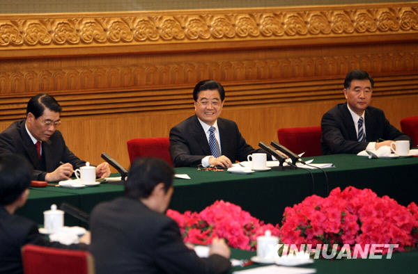 3月7日,中共中央總書記、國家主席、中央軍委主席胡錦濤參加十一屆全國人大二次會議廣東代表團審議。這是胡錦濤同代表們共商應對國際金融危機沖擊、推動經(jīng)濟發(fā)展、促進社會和諧穩(wěn)定大計。新華社記者蘭紅光攝