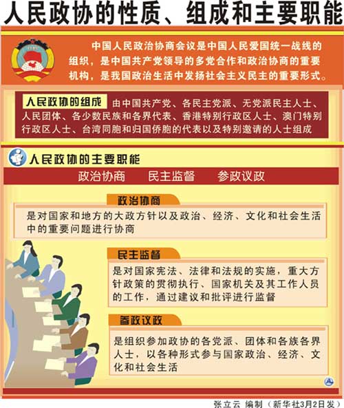 | 中國人民政治協商會議(簡稱人民政協)是由中國共產黨、各民主黨派、無黨派民主人士、人民團體、各少數民族和各界代表、香港特別行政區人士、澳門特別行政區人士、臺灣同胞和歸國僑胞的代表以及特別邀請的人士組成。