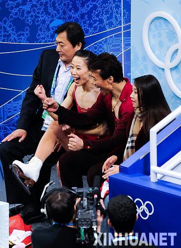 2月15日,中國選手申雪/趙宏博在比賽后慶祝。當日,在溫哥華冬奧會雙人滑比賽中,中國選手申雪/趙宏博以216.57分的總成績奪得冠軍。新華社記者戚恒攝 (左一為教練姚濱)