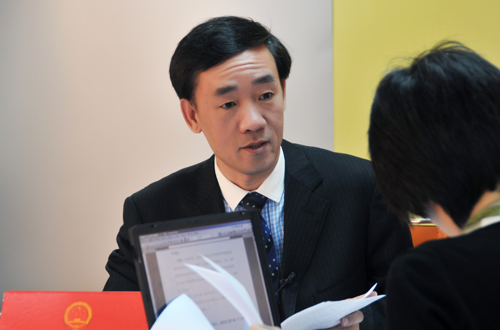 2010年3月7日10時,財政部新聞發言人、辦公廳主任戴柏華接受中國政府網專訪,解讀《關于2009年中央和地方預算執行情況與2010年中央和地方預算草案的報告》,并回答網民提問。圖為戴柏華回答網友提問。中國政府網 陳杰攝
