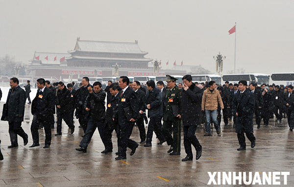 3月8日,十一屆全國人大三次會議在北京人民大會堂舉行第二次全體會議。這是全國人大代表冒雪抵達天安門廣場。新華社記者陳樹根攝