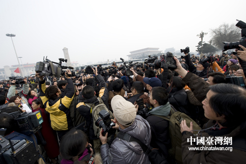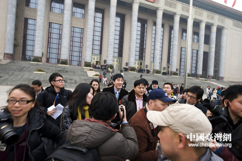 少數有心的記者還是發現了他,當問及今年有何提案時,劉翔未答,在人民大會堂東側廣場呈現出幾十名記者追逐劉翔的畫面。(中國臺灣網發 肖春陽、劉洋攝影報道)