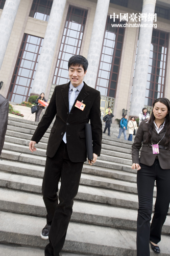 政協開幕式結束后,當大多數記者已經散去,劉翔才從人民大會堂東門記者通道小心走出來。(中國臺灣網發 肖春陽、劉洋攝影報道)