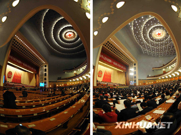 左圖:十一屆全國人大三次會議第四次全體會議開始前,大禮堂內(nèi)燈光僅有部分點亮,以節(jié)約電力(3月11日攝);