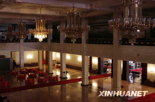 人民大會堂在上午的會議結(jié)束后采取節(jié)能措施,東大廳的五盞金色吊燈只亮中間一盞,回廊頂燈也只有部分開啟,以維持基本照明(3月10日攝)。新華社記者李響攝