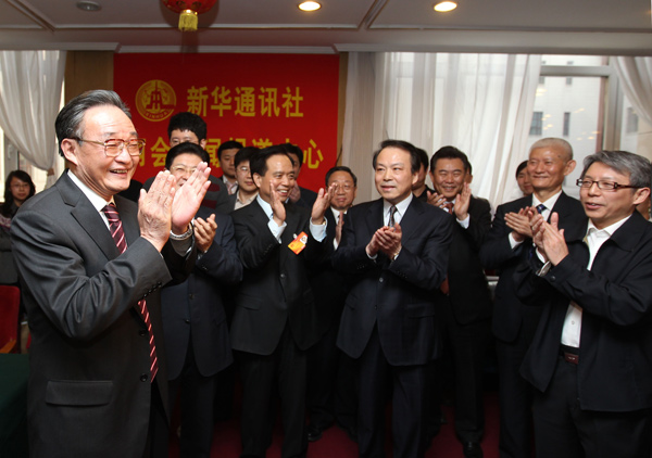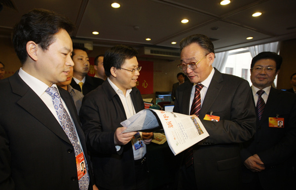 3月13日,中共中央政治局常委、全國(guó)人大常委會(huì)委員長(zhǎng)吳邦國(guó)親切看望新華社兩會(huì)報(bào)道人員。圖為新華社副總編輯吳錦才向吳邦國(guó)委員長(zhǎng)匯報(bào)《新華每日電訊》刊登的《為法治中國(guó)的宏偉大廈奠基——寫(xiě)在形成中國(guó)特色社會(huì)主義法律體系邁出決定性步伐之際》一稿,吳邦國(guó)委員長(zhǎng)說(shuō):“我看到這篇稿子了,寫(xiě)得很好!” 新華社記者邢廣利 攝