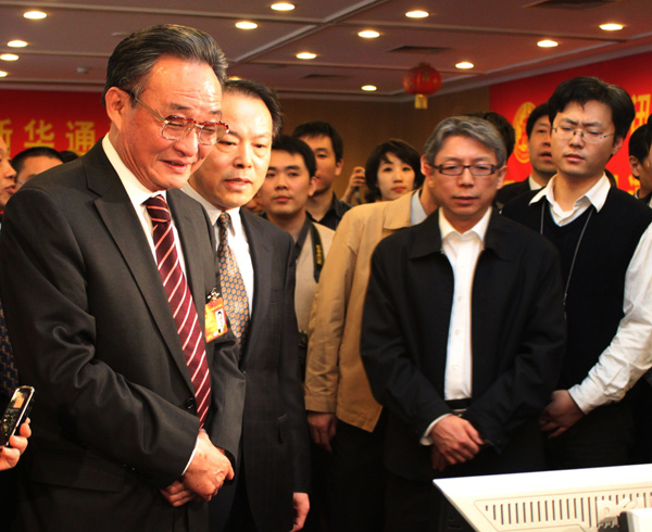 3月13日,中共中央政治局常委、全國(guó)人大常委會(huì)委員長(zhǎng)吳邦國(guó)親切看望新華社兩會(huì)報(bào)道人員。圖為吳邦國(guó)委員長(zhǎng)在瀏覽新華網(wǎng)兩會(huì)專(zhuān)題報(bào)道。新華社記者李響 攝