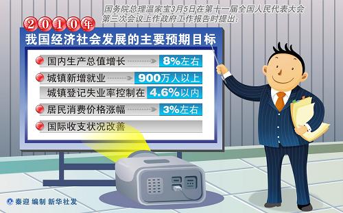 新華網北京3月5日電 中國國務院總理溫家寶5日在十一屆全國人大三次會議上所作的政府工作報告中,提出了2010年中國經濟的10個關鍵數據: