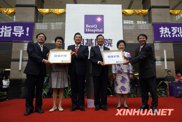 4月27日,陳云林(左三)、江丙坤(右三)等在南京明基醫(yī)院參觀時,展示醫(yī)院向他們贈送的健康護(hù)照。