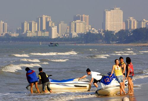 2009年10月6日,游客在海口市假日海灘游玩。海南2009年全年實現旅游收入206億元,同比增長8.1%。新華社記者趙穎全攝