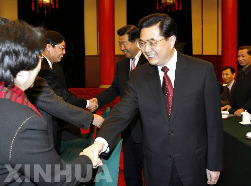 3月4日,中共中央總書記、國家主席、中央軍委主席胡錦濤看望了出席全國政協(xié)十屆四次會(huì)議的民盟、民進(jìn)聯(lián)組委員,聽取了委員們的意見和建議,并發(fā)表了重要講話。中共中央政治局常委、全國政協(xié)主席賈慶林一同參加看望。 新華社記者 蘭紅光 攝