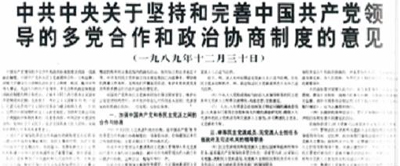 1989年12月30日,中共中央制定《中共中央關(guān)于堅持和完善中國共產(chǎn)黨領(lǐng)導(dǎo)的多黨合作和政治協(xié)商制度的意見》,使這一制度進一步規(guī)范化、制度化。