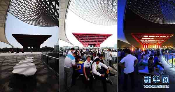 6月5日不同時段的上海世博園中國館和陽光谷(從上到下的拍攝時間依次為開園前后、白天參觀高峰時段,夜場時段)。