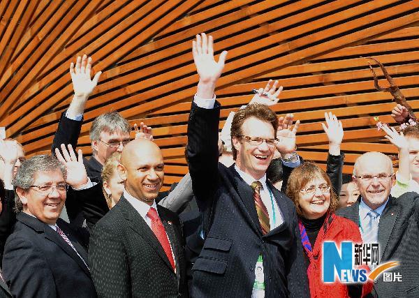5月1日,參加加拿大館開館儀式的嘉賓向游客揮手致意。當日上午9時,位于上海世博園C片區的加拿大館舉行開館儀式。 新華社記者王頌攝
