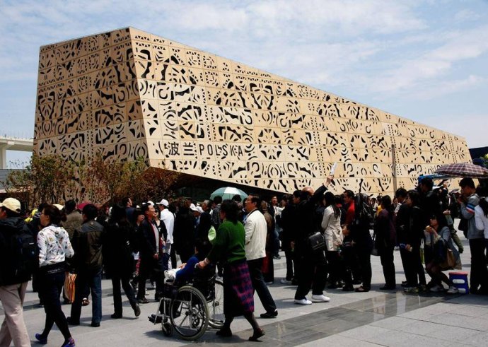 波蘭館位于上海世博園C片區(qū),與法國(guó)、德國(guó)、瑞士、英國(guó)等國(guó)家館為鄰。記者分別在白日和夜晚參觀該館,發(fā)現(xiàn)游客絡(luò)繹不絕,并且在排隊(duì)時(shí)就紛紛贊賞其外觀。因?yàn)橥鈮τ甚r明的鏤空剪紙圖案組成,在燦爛陽(yáng)光或者明亮燈光照射下,波蘭館明暗錯(cuò)落有致,形成獨(dú)特的光影效果。