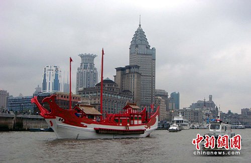 記者:一千多年前一艘艘木制的輪船帶著遣唐使從日本來到中國,開啟了中日兩國文化交流的大門,而即將亮相世博園的“遣唐使船”是在9日傍晚17點30分緩慢駛入到十六鋪碼頭一號泊位的。