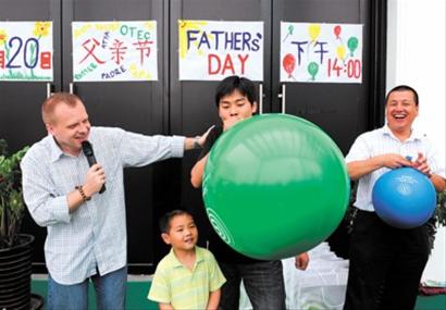 參與互動游戲的父親們正在比賽吹氣球。昨天,斯洛伐克館為父親節舉行了一個慶祝活動,工作人員與現場觀眾開展互動游戲。
