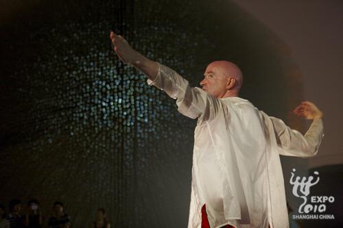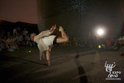 5日晚上,英國藝術家艾倫·格瑞格(Alan Greig)在“種子圣殿”前展現了精彩絕倫的蘇格蘭現代舞蹈藝術。艾倫 格瑞格是X Factor舞團的藝術總監,他的舞蹈作品集運動、刺激與娛樂性于一體,此次演出片段是根據他在2009年上海舞蹈節中首演的獨舞《Into the Light》改編而成。