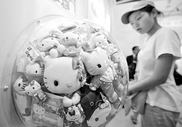 一名女孩在城市最佳實踐區大阪館展示的特別版HELLO KITTY玩偶前駐足 攝影:戴焱淼