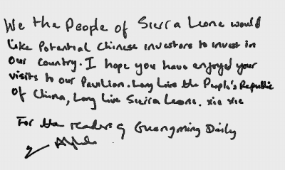 我們,塞拉利昂人民衷心希望中國投資商到我們的國家投資。我希望您在我們的展館參觀愉快。中華人民共和國萬歲,塞拉利昂萬歲。謝謝。
