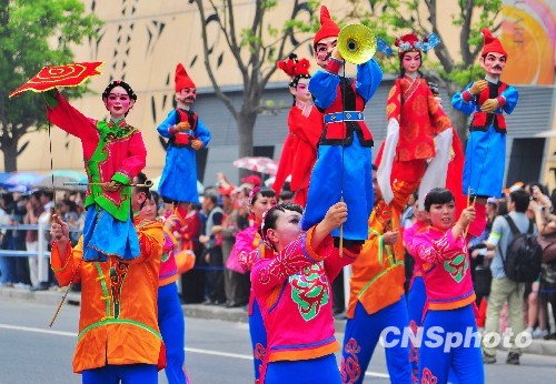 5月19日,上海世博會(huì)山西活動(dòng)周開幕。其中,盛裝巡游集中展示了太原鑼鼓、孝義木偶“娶親”、吉縣“壺口嗩吶風(fēng)情”、翼城花鼓、清徐背棍等山西民俗藝術(shù)。中新社發(fā) 沈春琛 攝