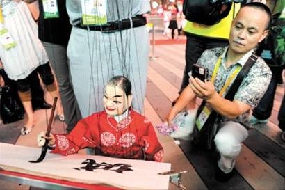 昨天,來自福建省連城縣的木偶表演藝術家李明卿在世博會寶鋼大舞臺用手中的提線木偶揮毫寫下了“城市,讓生活更美好”的世博會主題,讓在現場觀看的游客驚嘆不已。 本報記者 張馳 攝