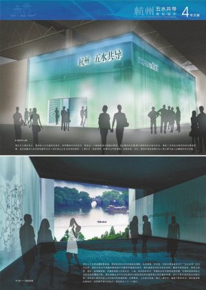 杭州館的設計是圍繞水與人的生活主線,通過“讀水”、“說水”、“聽水”和“品水”,展示杭州自古以來治理“五水”(西湖、運河、西溪、錢塘江、東海)而換取品質生活的主題。