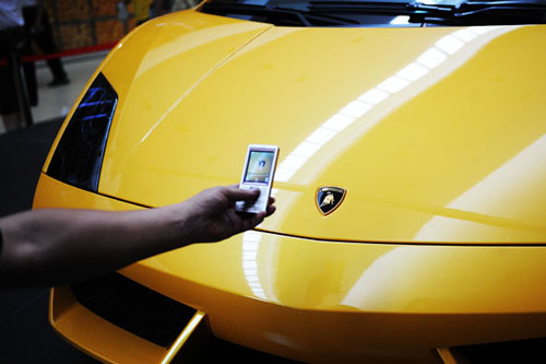 7月10日,游客在上海世博園城市最佳實踐區(qū)博洛尼亞案例館里拍攝陳列的蘭博基尼跑車。
