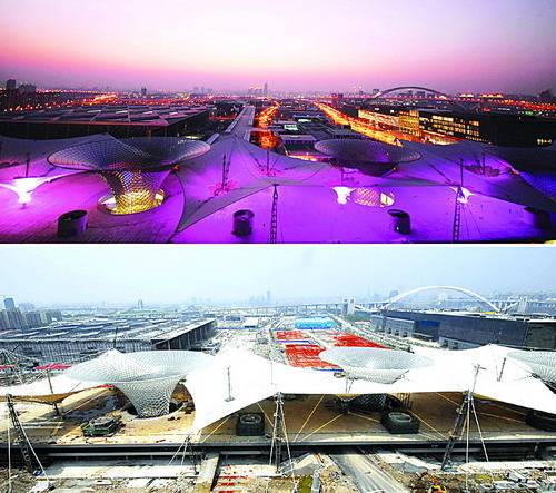1月21日,上海將迎來世博會開幕倒計時100天。目前,世博園區場館建設進入尾聲,上海世博園區正在以嶄新、完美的姿態迎接世博會的到來。上圖:世博會倒計時100天之際拍攝的進行夜景燈光調試的世博中心和世博軸(2010年1月18日攝)。下圖:世博會倒計時300天之際拍攝的世博中心和世博軸(2009年7月5日攝)。