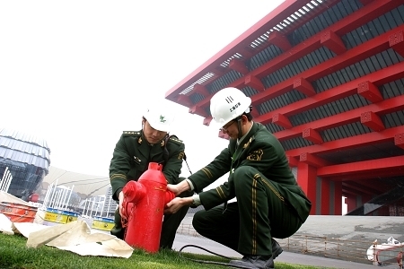 世博園布展已經(jīng)進(jìn)入沖刺階段,也是防火監(jiān)督最為困難的時期之一。各場館中晝夜施工、交叉作業(yè)、頻繁動火,火災(zāi)的風(fēng)險驟增。目前,上海消防進(jìn)一步加大現(xiàn)場防火監(jiān)管和執(zhí)勤力度,全力投入到世博場館布展安保工作中。