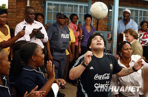 阿根廷國家隊主教練馬拉多納(中)受到南非蘇姍古威市一所學校學生的歡迎。新華社資料圖