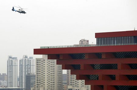 載著航空隊(duì)志愿者簽名旗幟的直升機(jī)將旗幟送入世博園。早報(bào)世博記者 趙昀 圖