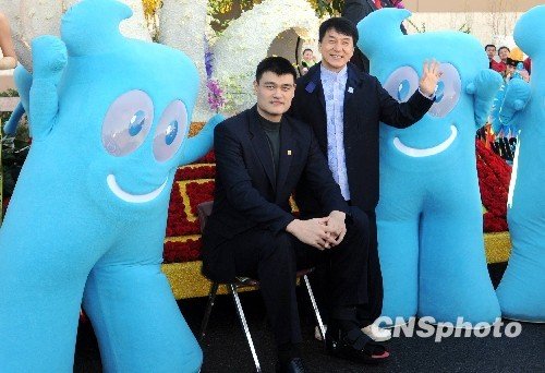 當地時間十二月三十一日,剛剛完工的上海世博會花車接受美國帕薩迪納玫瑰花車委員會的評審,NBA中國球星姚明和香港影星成龍抵達現場為上海世博會花車助陣。 中新社發 張煒 攝