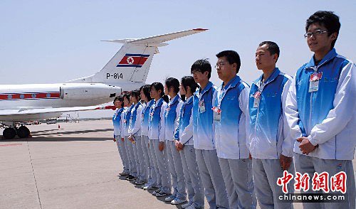 朝鮮最高人民會議常任委員會委員長金永南乘坐專機抵達上海,上海世博會志愿者到機場迎接