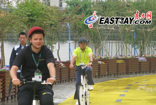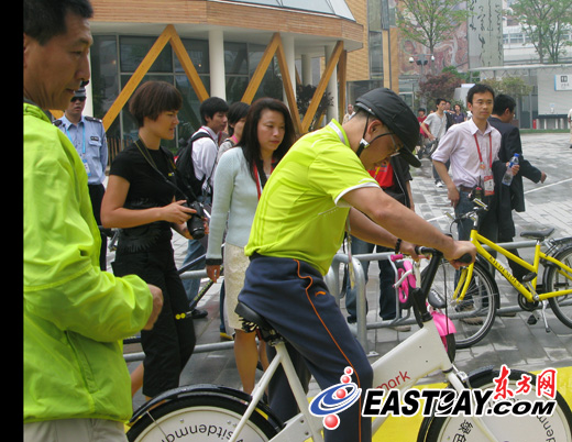 黃綠色的李寧運動短T,深色的李寧網球褲,白色的李寧運動鞋,再加一頂黑色的李寧鴨舌帽,今天上午10點半左右,在各路記者的簇擁下,昔日體操王子李寧出現在世博會浦西城市最佳實踐區,從馬德里案例區出來后,出現在了歐登塞展區,看著路邊停放著的一整排自行車,李寧也過了一把騎車癮,引起了游客的圍觀。