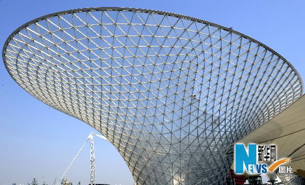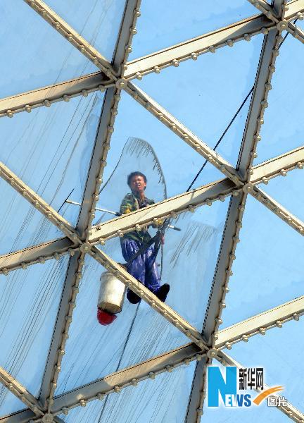 5月24日,一名工人在清洗世博園里的陽光谷。位于世博軸上的6個巨型透明“喇叭花”——陽光谷,每個高40米左右、開口最大直徑96米,從地下6.5米延展到地上35米,能將陽光、空氣引入世博園地下空間,運用生態技術節約能源。新華社記者 楊世堯 攝