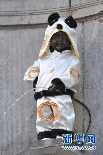 6月5日,比利時(shí)首都布魯塞爾著名的小尿童穿上了熊貓服。 當(dāng)天,小尿童穿上了由中國四川省成都市贈(zèng)送的熊貓服。在6月7日上海世博會(huì)成都館日上,比利時(shí)館的小尿童復(fù)制品也將穿上一件熊貓服。 新華社記者 武巍 攝