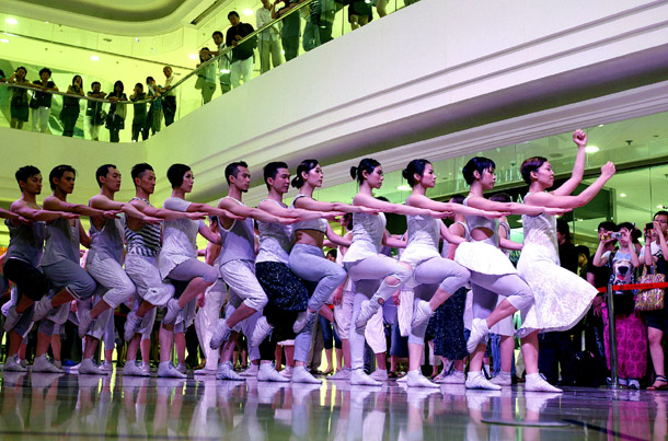 6月20日,香港舞蹈演員在商場里翩翩起舞。當日,參加上海世博園文藝演出的香港城市當代舞蹈團,專程來到上海市淮海路上的大上海時代廣場,為南來北往的游客獻上一場主題為《衣食住行》的舞蹈表演。在表演過程中,演員不時走到購物的游客中間起舞,讓觀眾零距離欣賞走出殿堂的舞蹈藝術。新華社記者 陳飛 攝