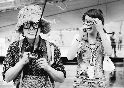 6月29日,一位游客被小丑的表演逗得開心大笑。為緩解游客排隊等候的疲勞,世博園各大場館妙招迭出。在加拿大館旁,四個滑稽搞笑的小丑吸引了人們的目光,成為世博園里一道可愛的風景。