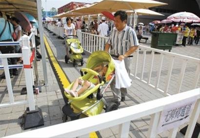 由于對綠色通道的新標準不了解,而且各展館的標準并未統一,很多參觀者仍然推著輪椅或嬰兒車過來排隊,館方工作人員只能不停地向參觀者解釋新規定。