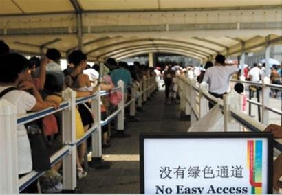 和沙特館一樣,英國館也嚴格采用了世博局的新綠色通道標準。昨天下午2點30分左右,記者在現場看到,一對聾啞夫婦在英國館綠色通道處向工作人員出示了殘疾證,但被工作人員婉拒。工作人員還示意這對夫婦觀看旁邊新修改的綠色通道提示牌,只見上面注明只有三類人可以從綠色通道優先進入:1、坐在輪椅上的殘疾人;2、行動不便的殘疾人;3、75歲以上的老人。由于無法提供身份證或老年證,一位老人也不得不遺憾地走向另一個展館。