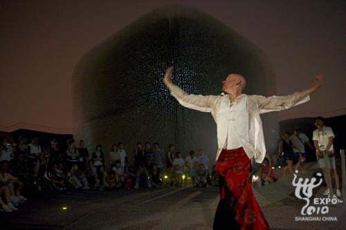 5日晚上,英國藝術家艾倫·格瑞格(Alan Greig)在“種子圣殿”前展現了精彩絕倫的蘇格蘭現代舞蹈藝術。艾倫 格瑞格是X Factor舞團的藝術總監,他的舞蹈作品集運動、刺激與娛樂性于一體,此次演出片段是根據他在2009年上海舞蹈節中首演的獨舞《Into the Light》改編而成。