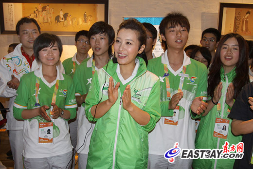 圖片說明:5月18日,著名青年歌唱家譚晶在中國元素畫坊與志愿者共同演唱世博志愿者歌曲《世界》。