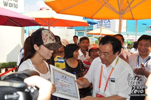 24日下午,上海世博會世界氣象館迎來第50萬名參觀者。受世界氣象組織和中國氣象局委托,上海市氣象局局長湯緒為這名幸運(yùn)者——來自上海的陸萍女士頒發(fā)了紀(jì)念證書,世界氣象館也向她贈(zèng)送了豐厚的大禮包。