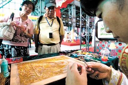 技師用鑷子將金屬絲彎曲成各種造型,再填入琺瑯彩釉,一幅掐絲畫就呈現在游客面前。昨天(17日),青海非物質文化遺產在寶鋼大舞臺展演區展示。(蔣迪雯 攝)