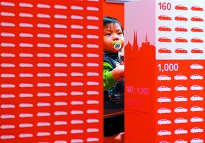 □不來梅館內(nèi),一名小觀眾在看通過“拼車”實現(xiàn)“160輛汽車可取代1000輛汽車”功效的展板。新華社圖片