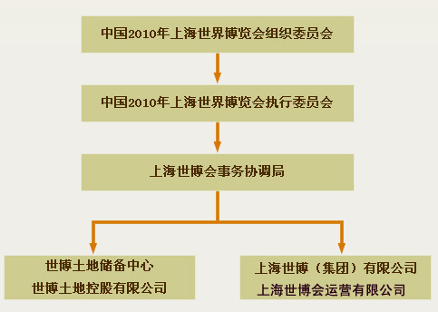 中國中央政府成立中國2010年上海世博會(huì)組委會(huì)(簡稱組委會(huì)),作為全國籌辦上海世博會(huì)的領(lǐng)導(dǎo)機(jī)構(gòu);組委會(huì)下設(shè)執(zhí)委會(huì),作為組委會(huì)具體工作的執(zhí)行機(jī)構(gòu);執(zhí)委會(huì)的日常辦事機(jī)構(gòu)是上海世博會(huì)事務(wù)協(xié)調(diào)局。