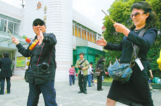 40余名長三角世博主題體驗之旅首發團成員來到閘北區臨汾社區,體驗上海人的生活。圖為兩名游客在參與空竹游戲。