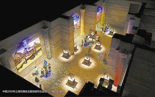 城市足跡館分為三個(gè)展區(qū),分別表現(xiàn)城市文明的出現(xiàn)、成熟,以及全球城市化帶來(lái)的挑戰(zhàn)。 展館核心思想是:在走向現(xiàn)代文明的歷程中,人、城市、環(huán)境一直在互動(dòng)發(fā)展。在這個(gè)過(guò)程中留下的人類足跡,反映了人類文明的智慧和成就。