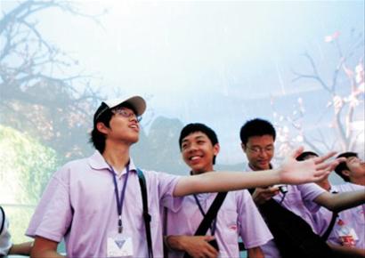 一組4人穿著同樣的T恤在世博園內參觀,言語間還有臺灣口音,讓她們與其他游客略有不同,一些好奇的游客主動走過來與她們攀談。“你們是臺灣來的?”“是啊。”“是學生嗎?什么學校的?”“我們是建國高中的。”